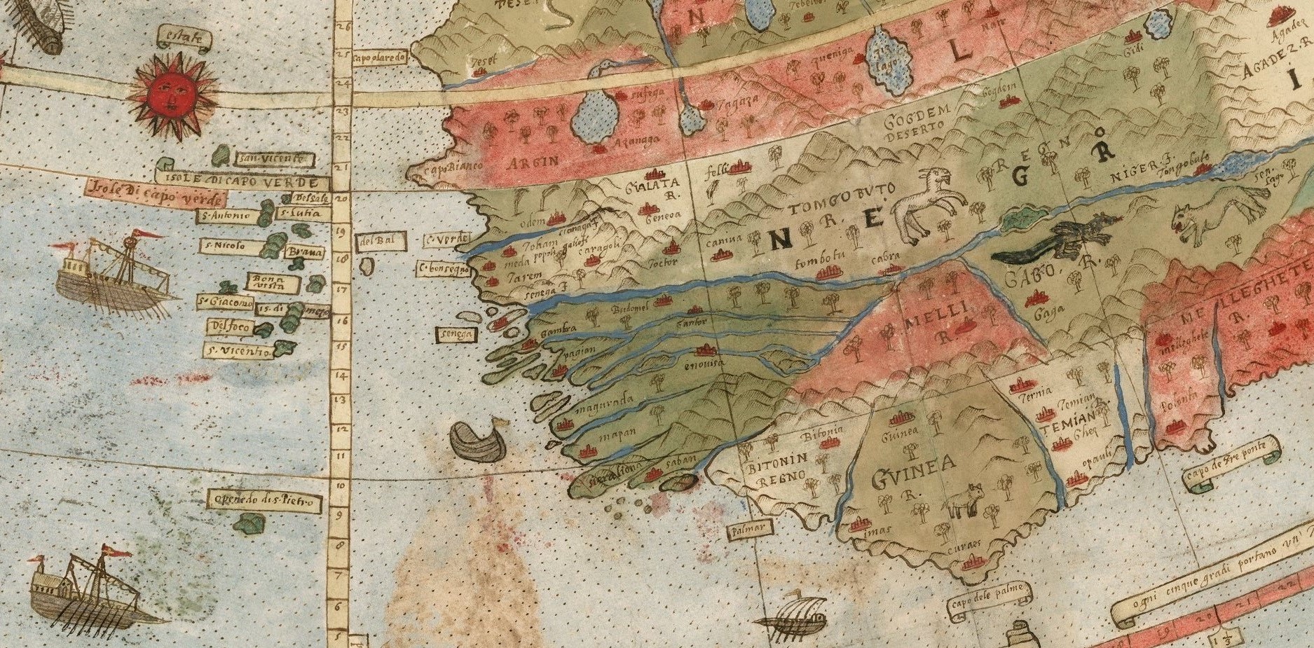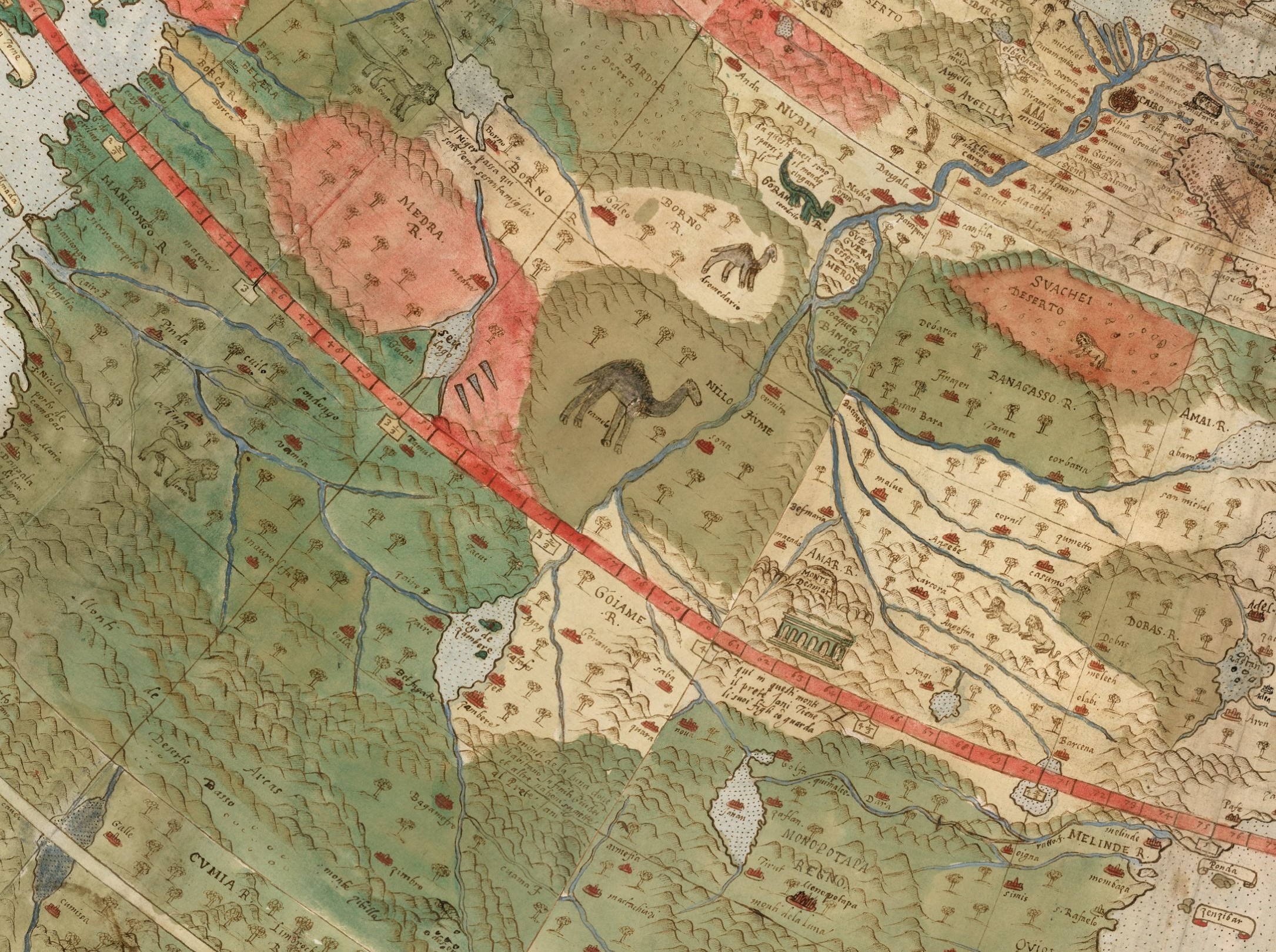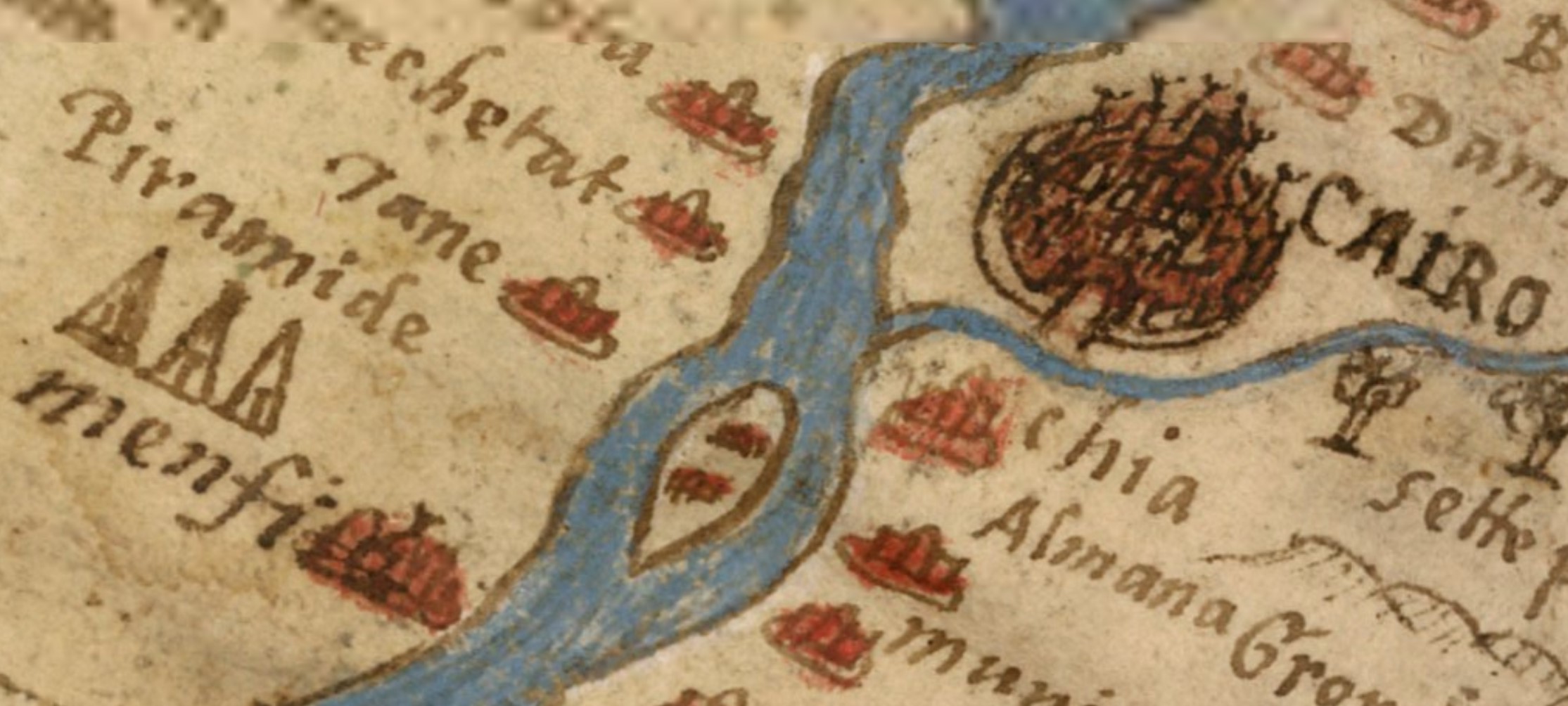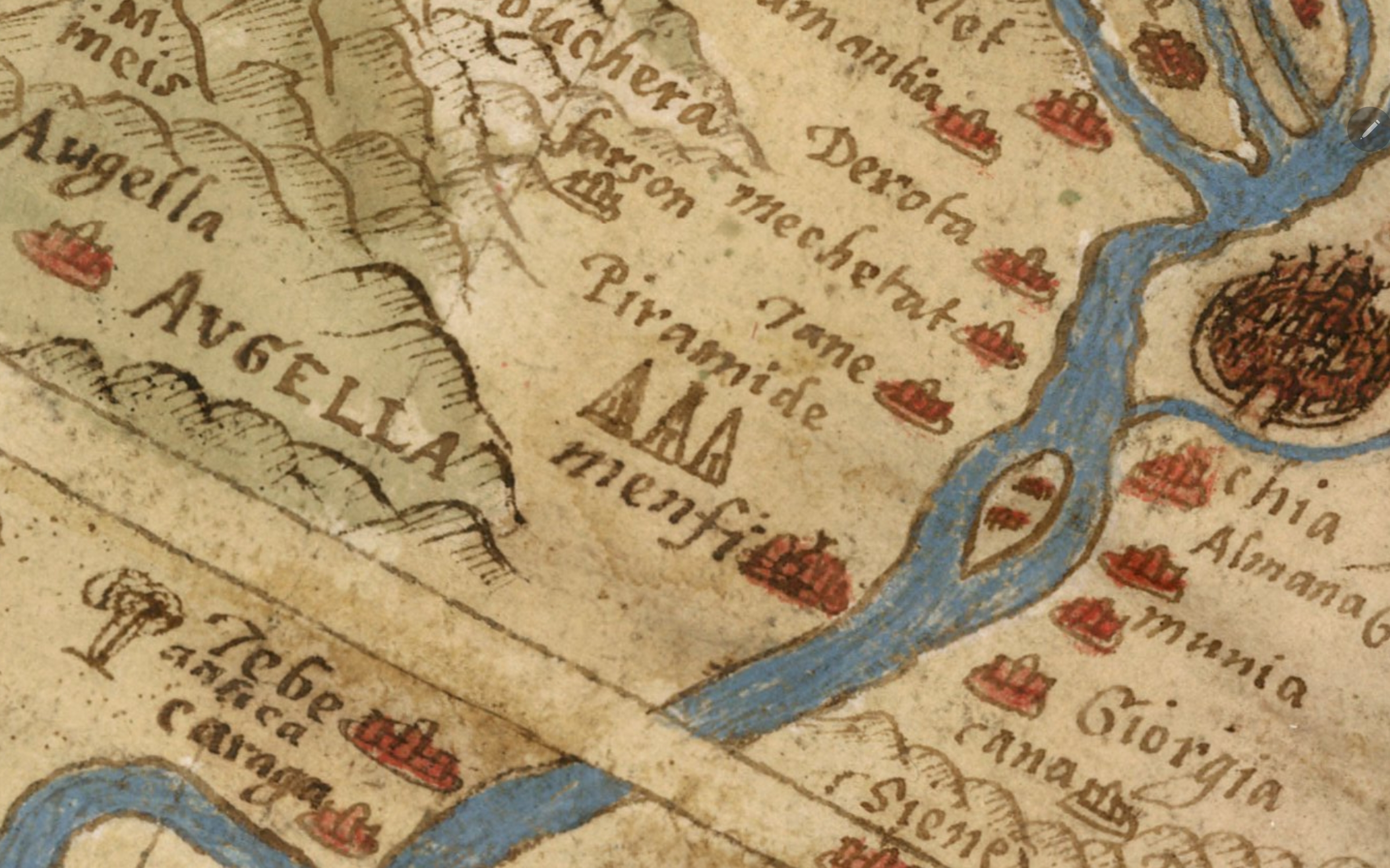 Puțin mai jos de Cairo, care este mare și intens populat, vedem cele 3 piramide desenate în Egipt. Foarte aproape observăm Menfi/Memphis, care era cunoscut în secolul XVI din surse clasice (Herodot, Pliniu), ca fostă capitală a Egiptului antic. Avem aici un exemplu de cartografie istorică erudită. Ceea ce frapează însă, este o prezență curioasă pe continentul african, o megastructură probabil antică, sau un marcaj special al unui tărâm fabulat și mult căutat.