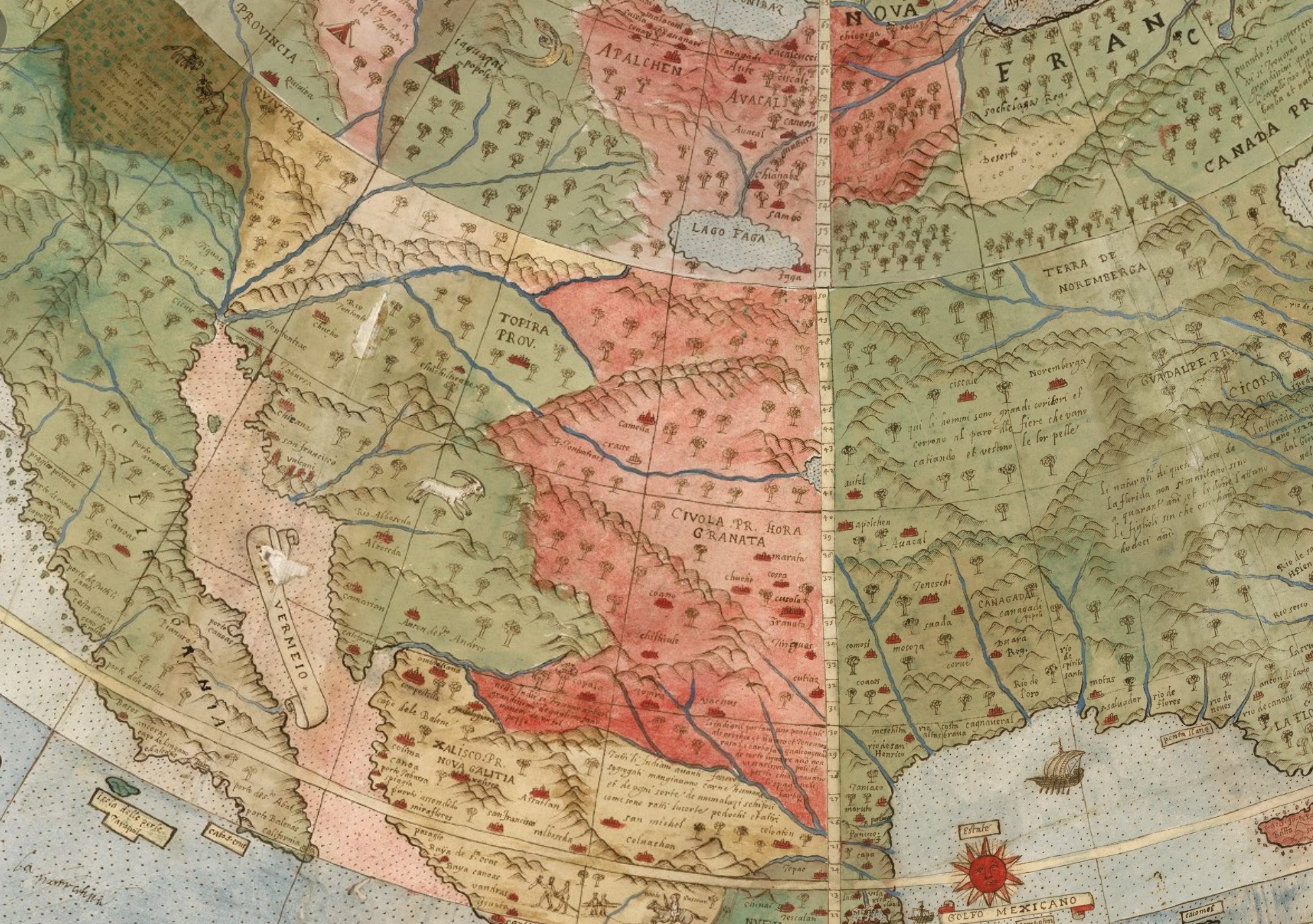 Apoi, în nord-estul Americii de Nord, apare ”Larcadia Prov.” (o colonie franceză), cu 17 ani înainte de fondarea oficială din 1604. Numele marchează o așezare reală, o regiune deja cunoscută exploratorilor și revendicată simbolic. Prezența ei pe hartă, cu atât de mult timp înainte de colonizare, poartă aerul unui mister.