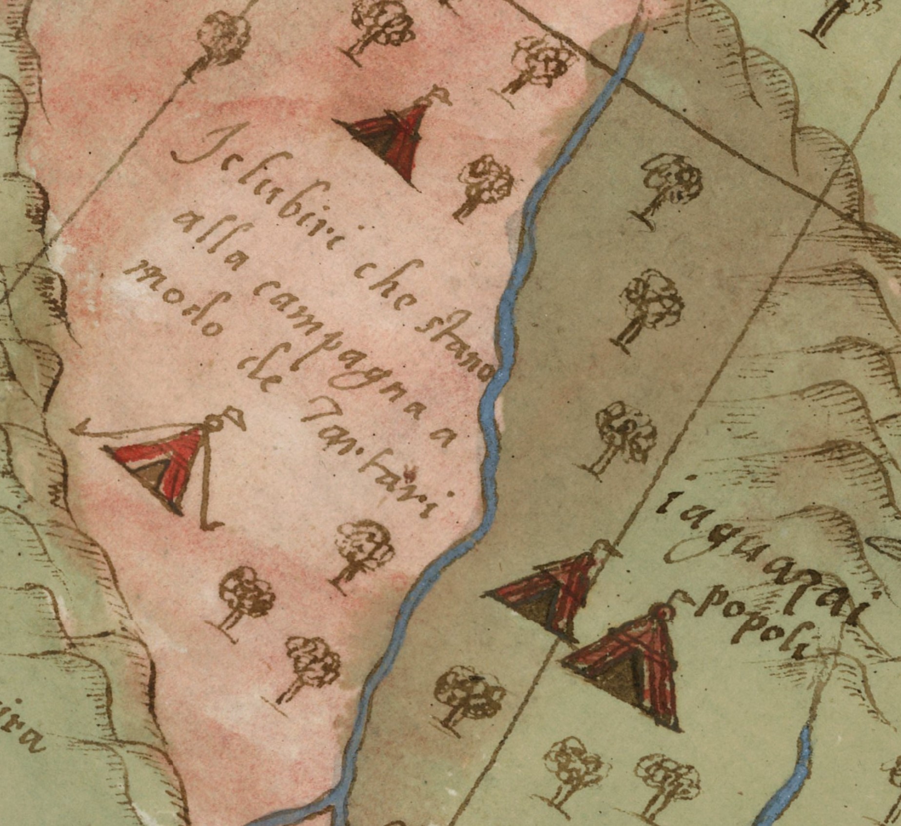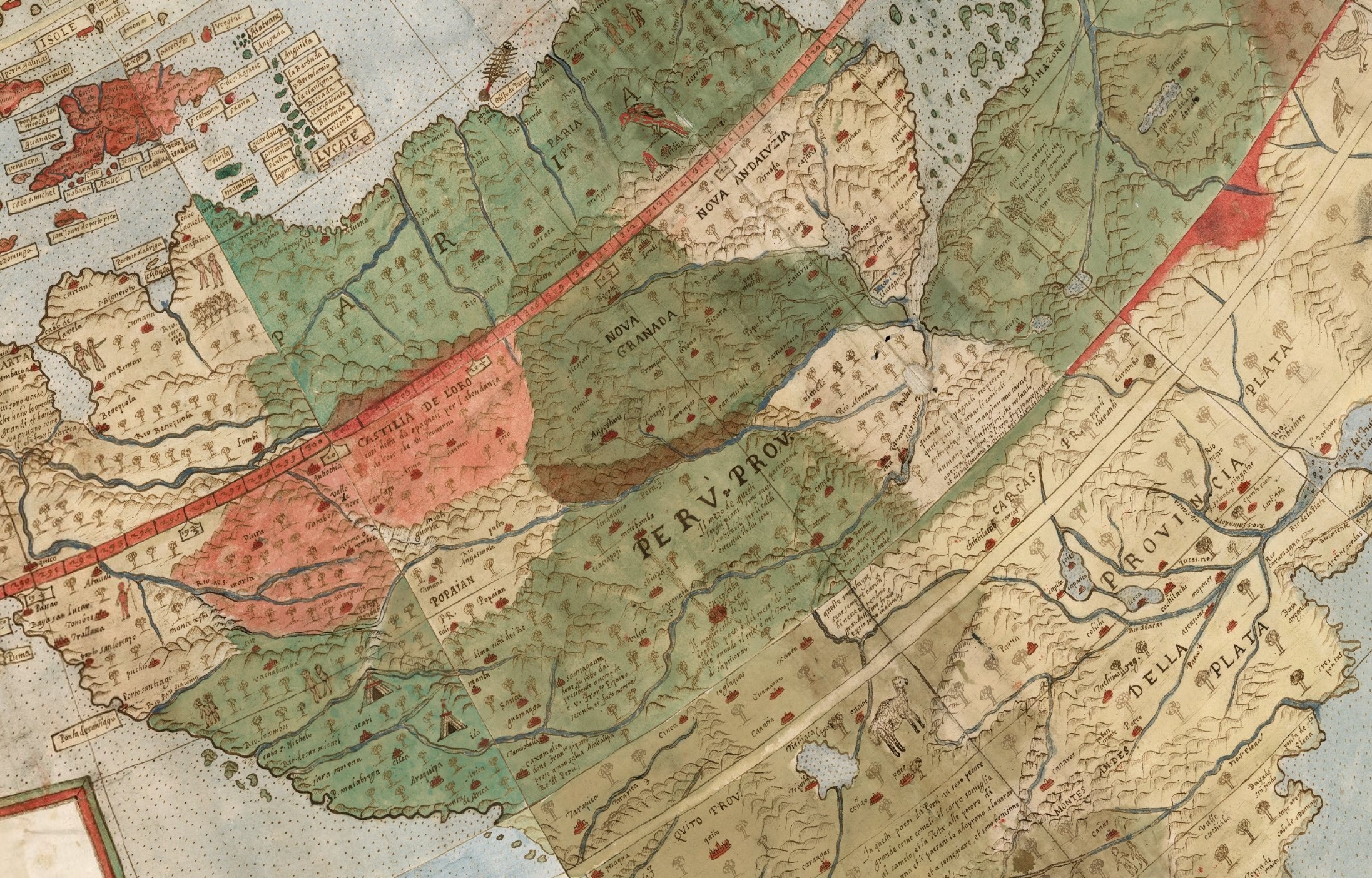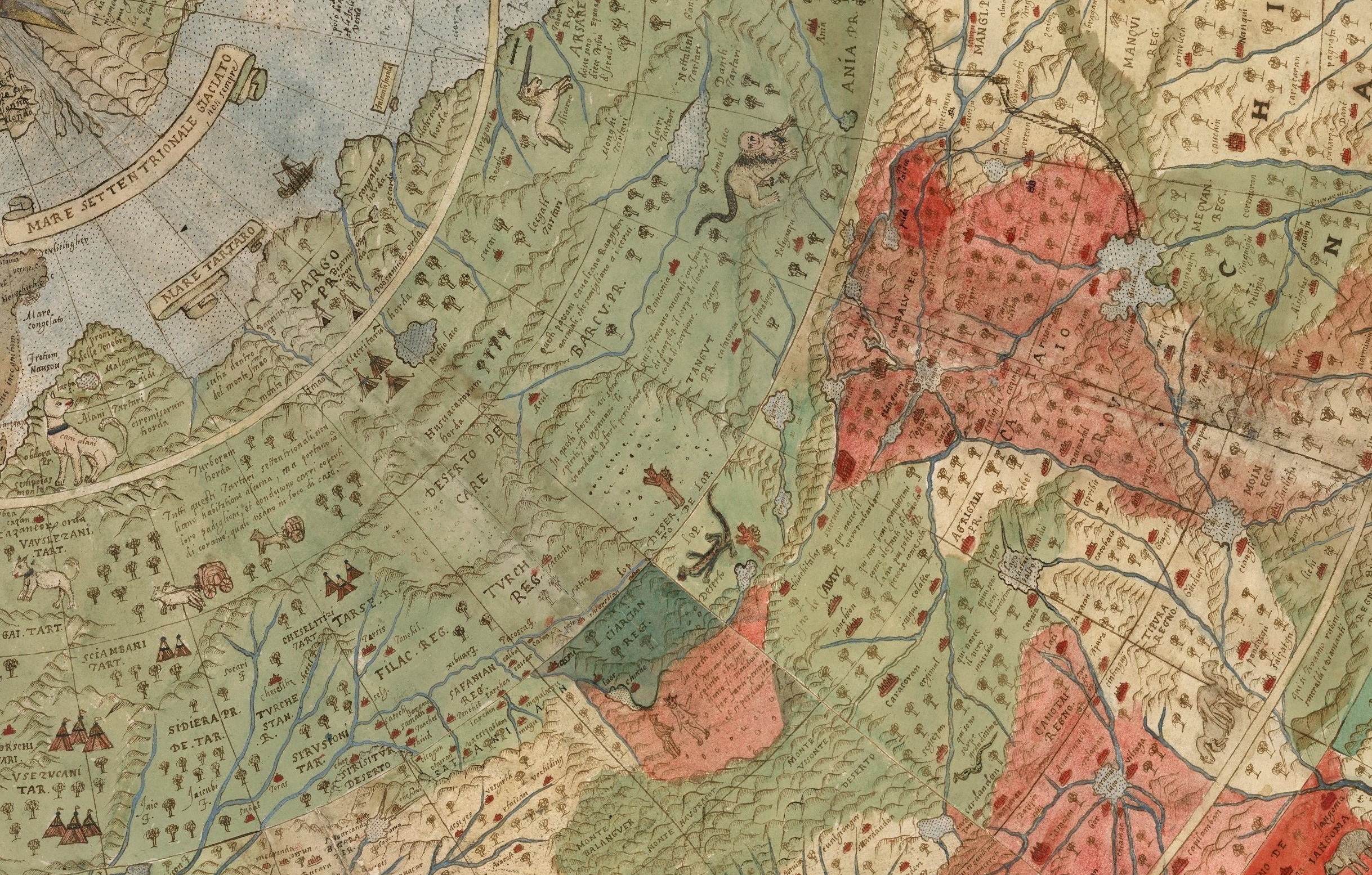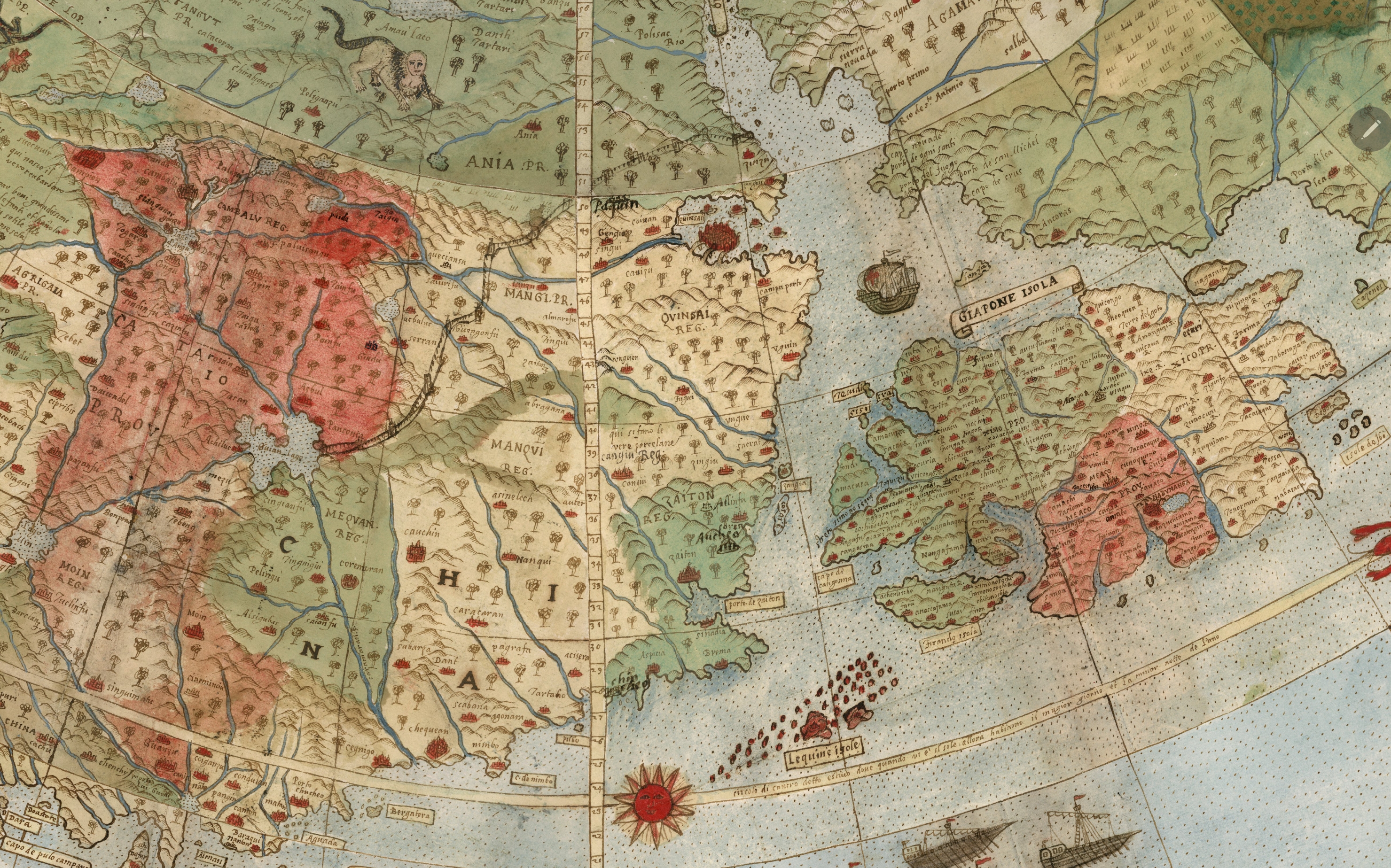 China arată ca un imperiu vast și bine organizat, protejat de Zidul Chinezesc care marchează granița nordică și apare ca o linie lungă și continuă, simbol al granițelor apărate și al măreției civilizației. Pe oceane, nave etichetate „Armata del Re’ della China”, cu steaguri roșii și vâsle fără vele, apar în Asia de Sud-Est, Pacific și aproape de coastele Africii, semn al puterii navale remarcabile a Chinei. Harta surprinde astfel un stat care își controlează teritoriul pe uscat și proiectează influență pe mare, ilustrând autoritatea și prestigiul global al Chinei în ochii Europei renascentiste.