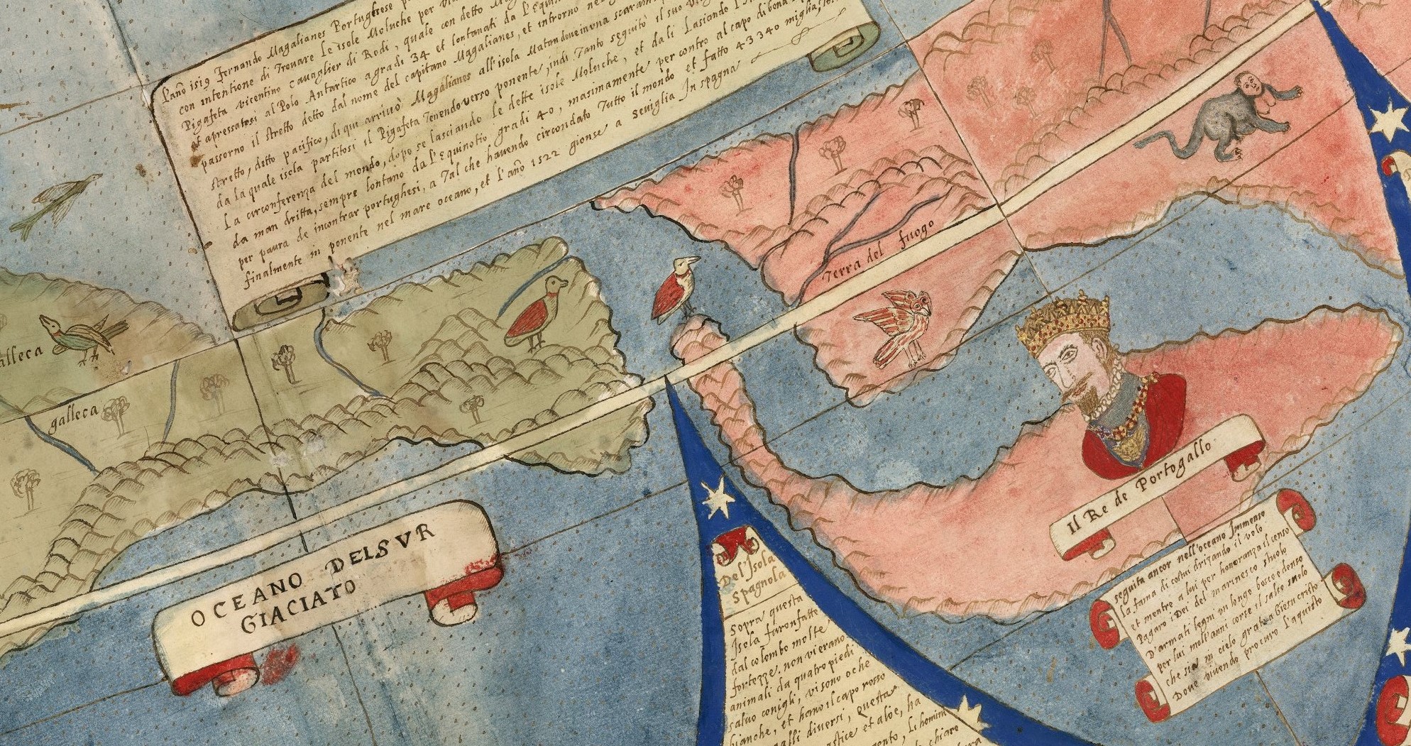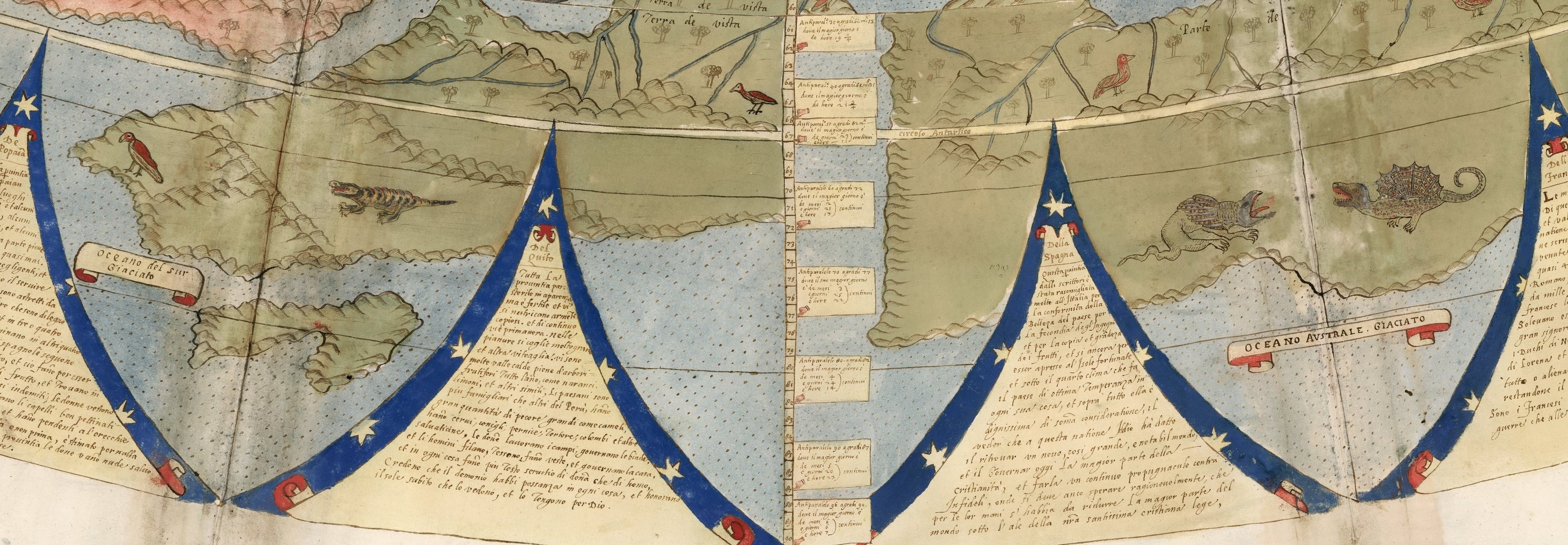 Pornind din centru spre exterior în cercuri concentrice, avem următoarele teritorii, Polul Nord și Cercul Polar Arctic, Ecuatorul și apoi cele 8 mari insule care constituie ipotetic Continentul Sudic. Acestea din urmă sunt pentru noi cei de acum, teritorii mitologice, am zice fabulate, pentru că asta se întâmpla cu mult înaintea descoperirii Antarcticii (Antarctica a fost descoperită oficial în 1820). Pe inelul exterior (adică la Polul Sud care este circular reprezentat), avem 8 portrete de regi intercalate de 36 de triunghiuri pline cu informații scrise. Textul descrie și dezvoltă detalii din interiorul hărții (despre popoarele Europei, Americii de Sud, ale Asiei etc.). În cele patru colțuri avem patru roze circulare cu informații despre vânturi, zone climatice, solstiții și eclipse.