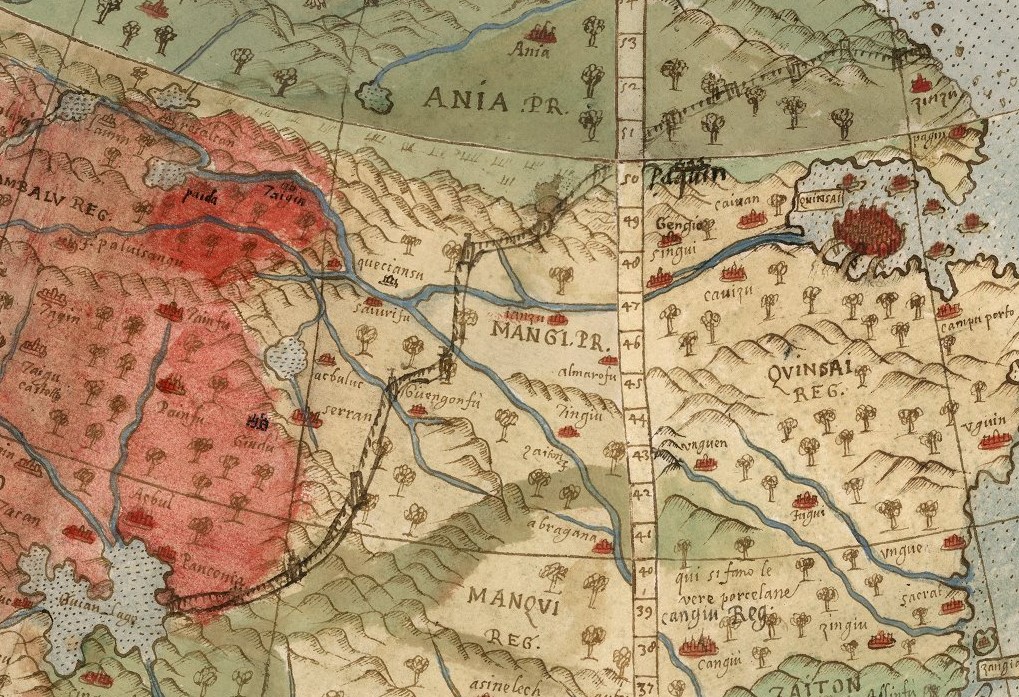 China apare ca o vastă masă continentală orientală, cu orașe importante precum Quinsai (Hangzhou) și Tianjin, reflectând geografia din perioada târzie a dinastiei Ming, adesea cu trăsături stilizate și linii de coastă exagerate, arătând o combinație între înțelegerea cartografică europeană și cunoștințele geografice chineze din acea epocă, punând accentul pe porturile importante și regiunile din interiorul continentului.