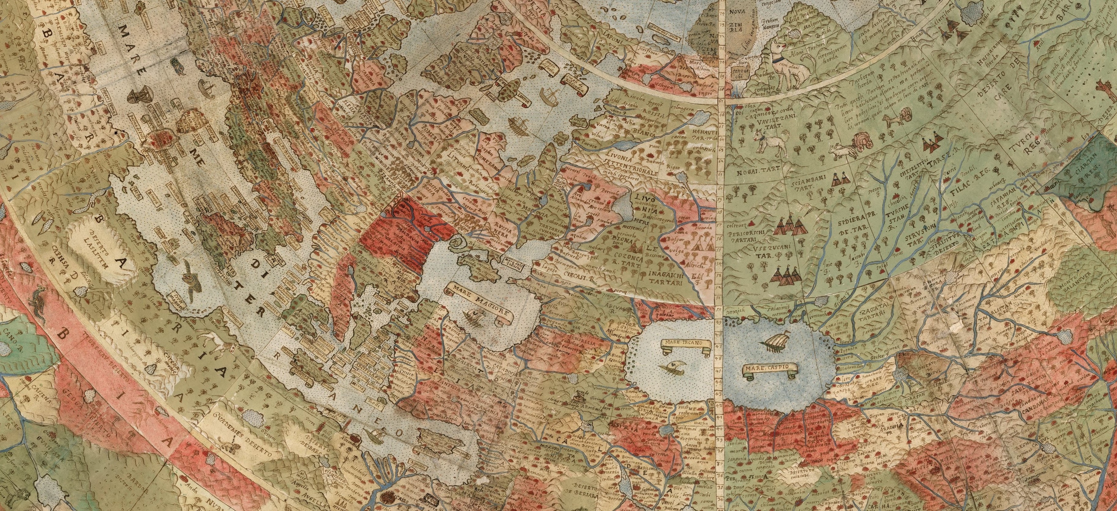 Pe harta lui Urbano Monte, Asia apare ca un continent imens, bine conturat la margini și tot mai vag spre interior. Țărmurile Chinei și Japoniei sunt desenate cu grijă, semn al contactelor comerciale și al informațiilor recente ale epocii, în timp ce regiunile centrale se adună sub denumiri incitante precum Tartaria. Este o Asie a certitudinilor de coastă și a necunoscutului continental, nu extravagantă, ci incomplet cunoscută, surprinsă exact atât cât permitea lumea anului 1587.