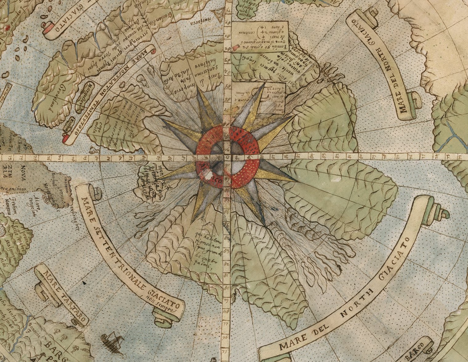 Deocamdată vom menționa aici trei aspecte interesante. 1. Prezența literei G fix în inima hărții, pe poziția centrului cosmografic. Aceasta reprezintă în limbajul cartografic vechi, un simbol, marchează originea măsurii și a mișcării, punctul zero de la care se definesc rotația, drumul și destinația pe suprafața plană/sferă a lumii (locația marcajului exact în centrul lumii la Polul Nord, ca destinație finală, e o altă temă de investigat).