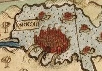 Quinsai (Hangzhou): un oraș portuar important, adesea reprezentat în mod proeminent datorită importanței sale istorice și dimensiunii sale în timpul dinastiei Ming, apare ca un oraș-insulă spectaculos, legat de uscat prin trei poduri, scăldat de aceeași mare în care se termină Marele Zid Chinezesc. Imaginea nu descrie probabil un loc real din nordul Chinei, ci viziunea europeană renascentistă asupra unui oraș legendar al Orientului. În realitate se pare că, „Quinsai” este Hangzhou, faimosul oraș al canalelor și al bogăției descris de Marco Polo, mutat greșit pe hartă și transformat artistic într-o insulă pentru a sugera apa, comerțul și măreția sa. Este un exemplu fascinant de geografie real-imaginară.