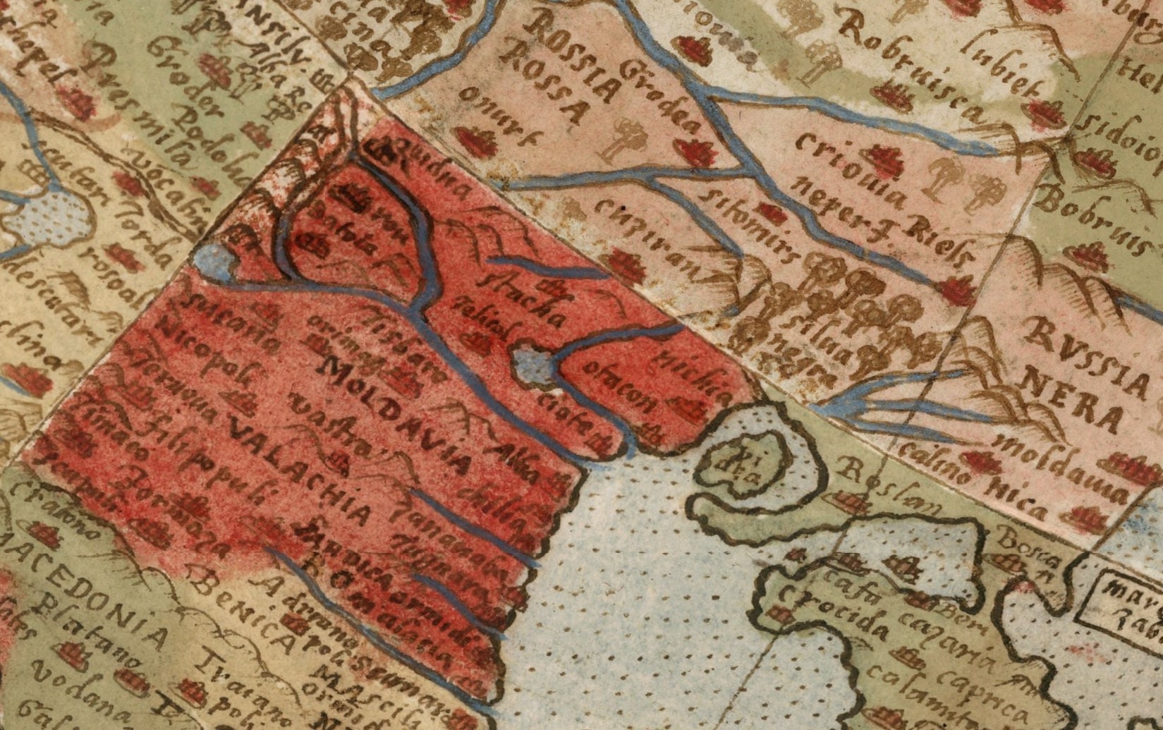 Pe harta lui Urbano Monte, Europa iese în evidență prin precizie, relief clar, orașe numeroase și munți bine marcați. Italia este detaliată și ușor supradimensionată, reflectând privirea unui cartograf italian asupra lumii. Țările Române sunt bine reprezentate, Valachia (Valahia), Moldavia (Moldova) și Transilv. (Transilvania) apar distinct, ca entități geografice cunoscute ale epocii. Spre est, informația se estompează, iar golurile devin vizibile. Fără creaturi misterioase, Europa apare ca o ancoră de certitudine, un teritoriu sigur și familiar.