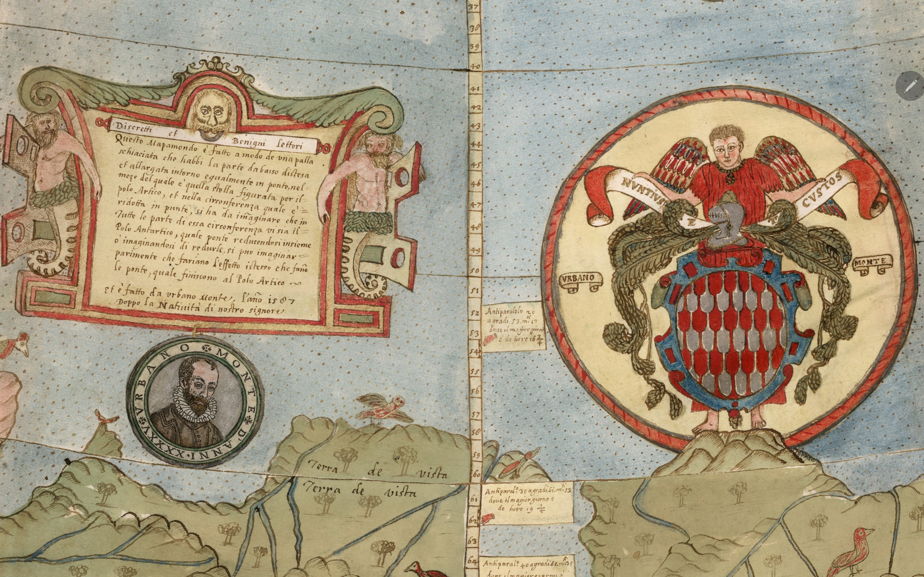 Pe harta lui Urbano Monte, centrată pe Polul Nord, Terra Australis Incognita se află la marginea periferică a planisferului, în emisfera sudică, sub America de Sud, Africa și Asia, întinzându-se ca un inel sau continent schematic care înconjoară lumea cunoscută, reprezentând un teritoriu ipotetic și nedescoperit. Astfel, pe marginea circulară a hărții, Monte colorează un continentul sudic ca pe un tărâm imens, misterios și puțin explorat. Această regiune nu este locuită doar de gheață: ar putea ascunde insule necunoscute, creaturi fabuloase sau pasaje de trecere către tărâmuri uitate. Nu este un simplu capăt de hartă, ci mai degrabă o frontieră simbolică dincolo de care începe necunoscutul.