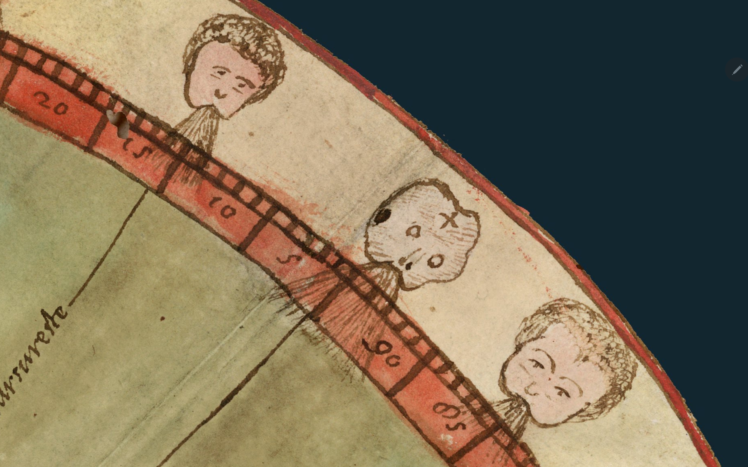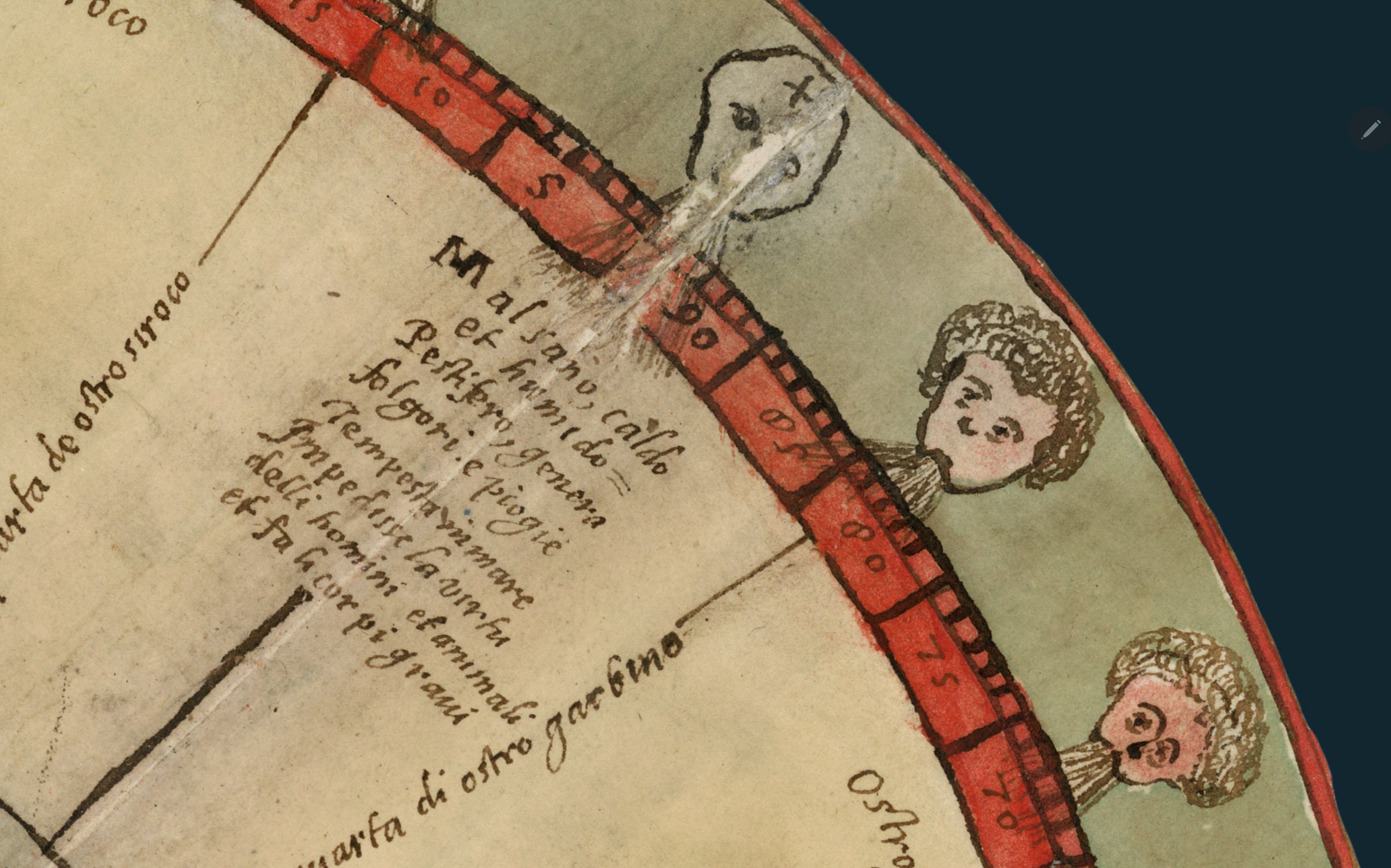 Rozetele vânturilor (stânga sus și dreapta jos) nu sunt doar niște diagrame, ci portrete ale forțelor invizibile care afectează lumea prin influența lor. În ambele colțuri, în poziția nord–nord-vest, apare un vânt unic, albastru, cu chip sever, aproape scheletic cu o cruce pe frunte. Textul îl descrie ca aer cald și umed, aducând furtuni pe mare, ploi torențiale, boli pentru oameni și animale, împiedicând virtutea și punând presiune pe corpuri. Monte îl plasează de două ori identic, ca o prezență amenințătoare, un semnal de alarmă pentru navigatori. Vânturile devin astfel personaje, simboluri ale capriciului naturii, iar tradiția cartografiîcă a rozelor vânturilor capătă aici o notă de avertisment și gravitate.