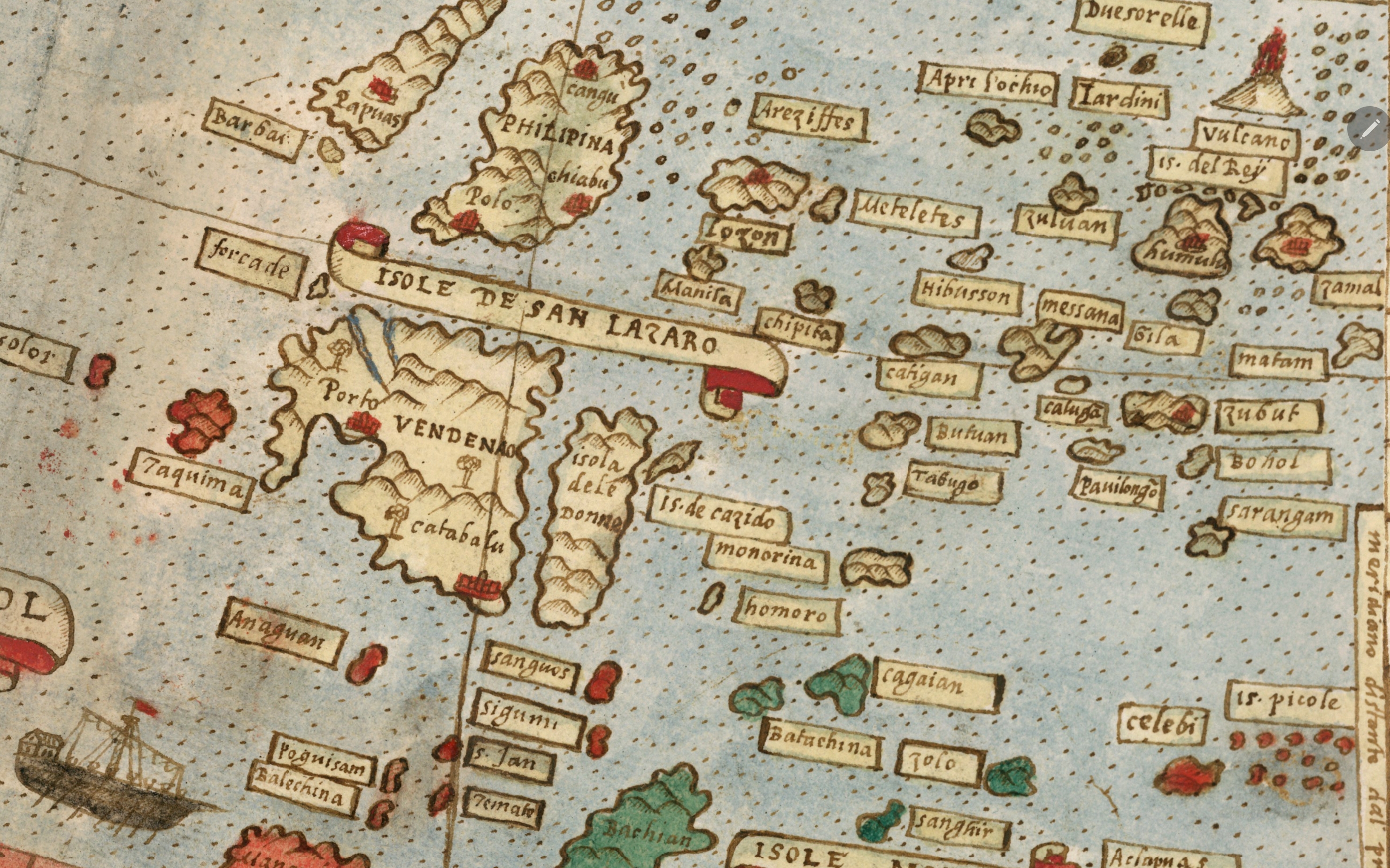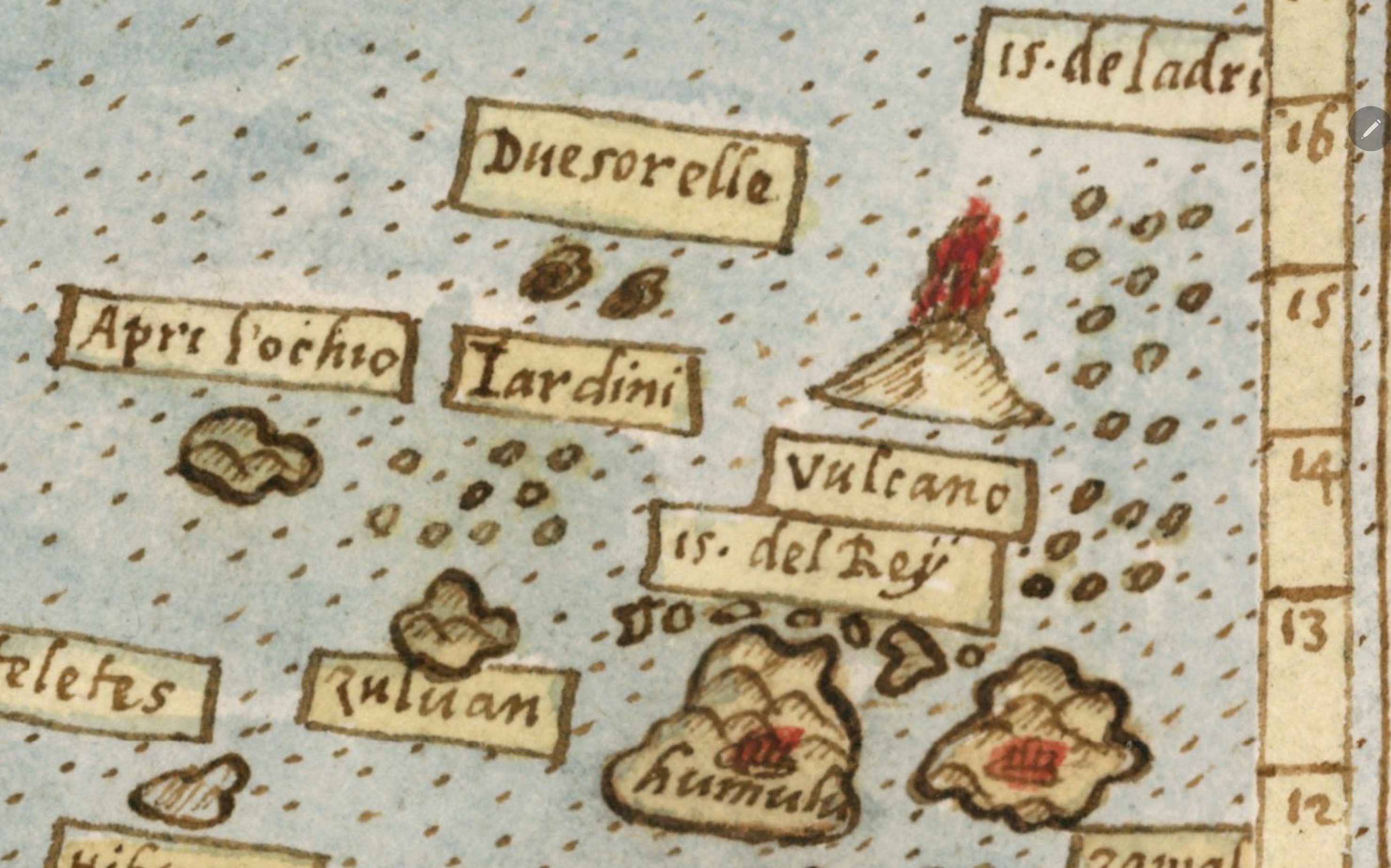 Marele ”absent” al hărții este Australia, sau poate nu? Puțin mai sus de locul unde ar trebui să fie Australia, descoperim o multitudine de insule și insulițe. Observăm printre altele ”Philipina” (Filipine) și un vulcan impresionant în toată această fărâmițare și spațiu indonezian. Este de notat faptul că spațiul indonezian este plin de vulcani activi și inactivi, fiind situat pe Cercul de Foc al Pacificului, zona cu cea mai intensă activitate vulcanică din lume.