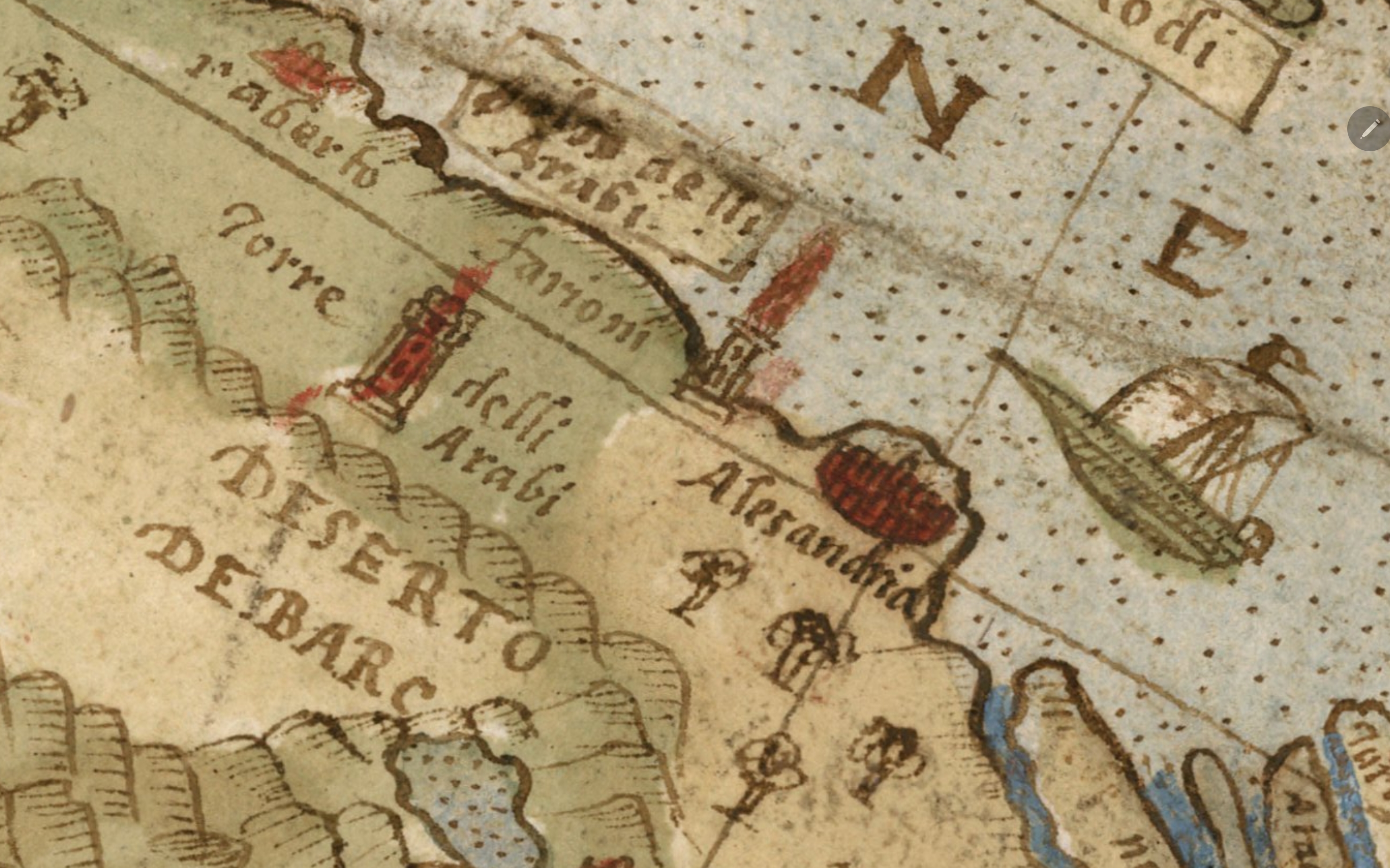 Puțin mai în dreapta de Barbaria, aproape de țărmul Mediteranei, vedem orașul port Alexandria bine conturat și populat. Chiar lângă pe țărm, observăm desenat, probabil chiar Farul din Alexandria. Flacăra uriașă simbolizează importanța și vizibilitatea sa de la distanțe mari. Farul din Alexandria, a fost una dintre cele Șapte Minuni ale Lumii Antice, fiind unul dintre cele mai înalte edificii ale antichității (avea între 100 și 140 m).