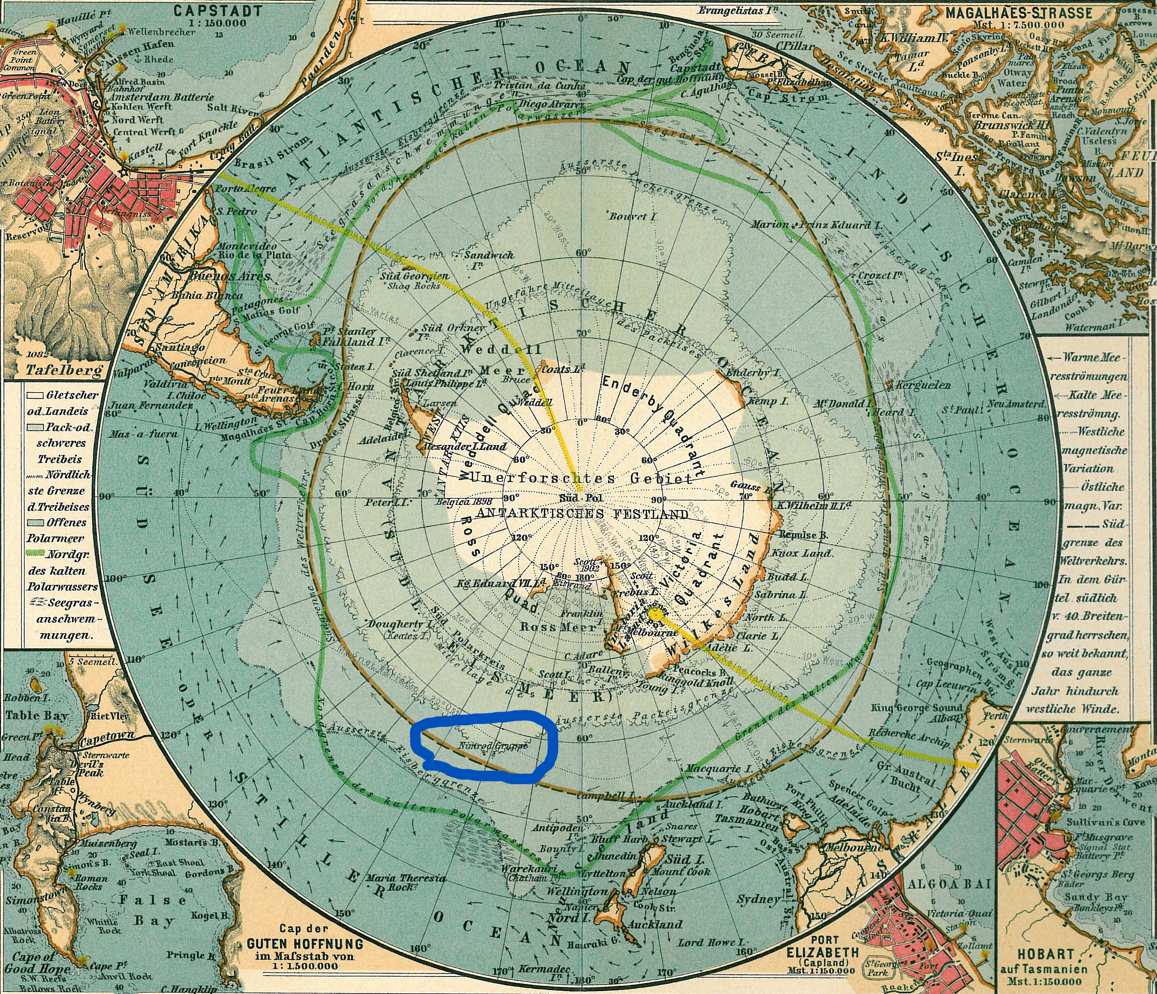 Mai jos detaliu dintr-o hartă a Antarcticii publicată de Justus Perthes în limba germană în 1906 unde vedem Insulele Nimrod (Nimrod Gruppe in germană).
