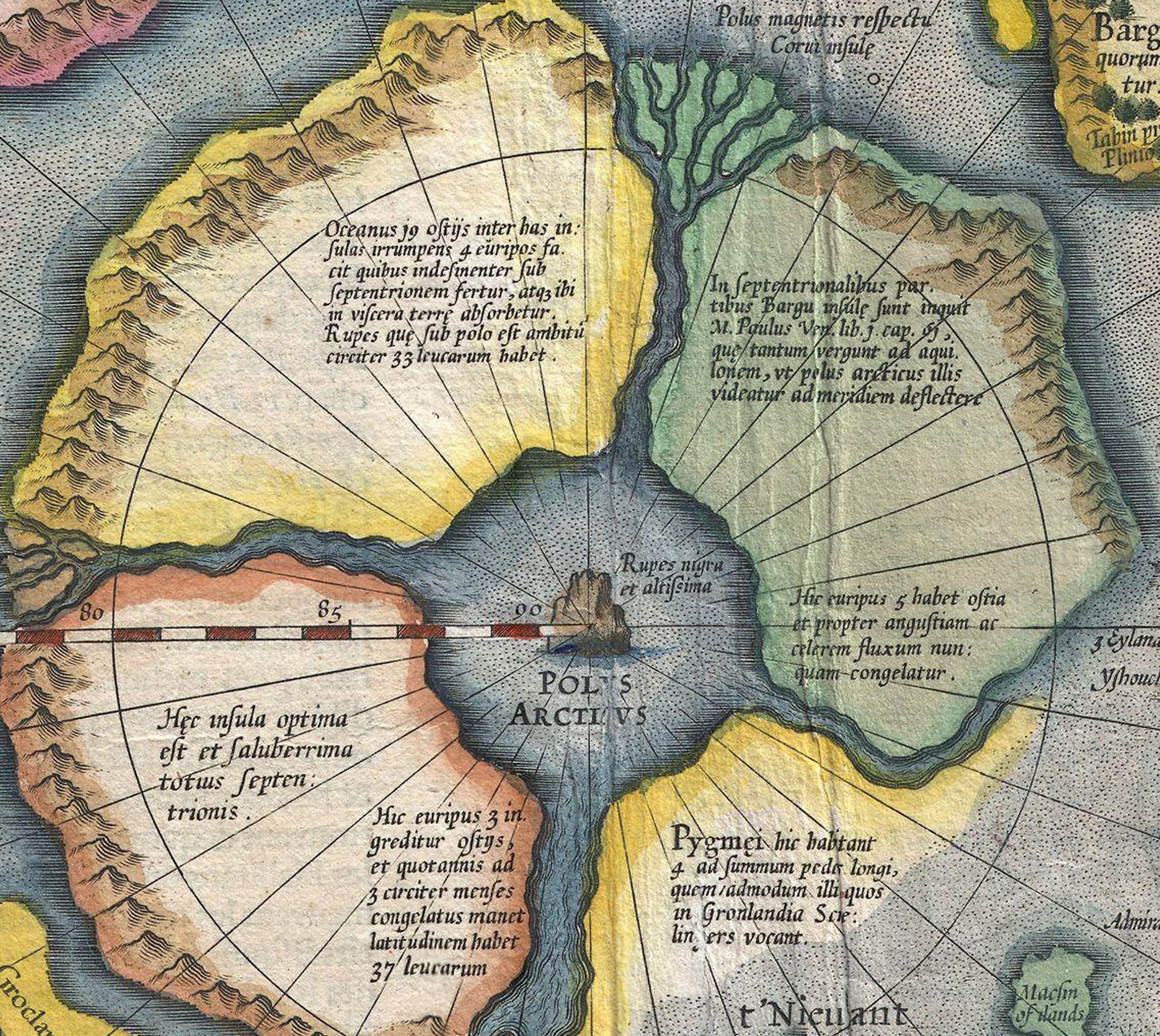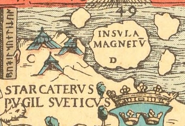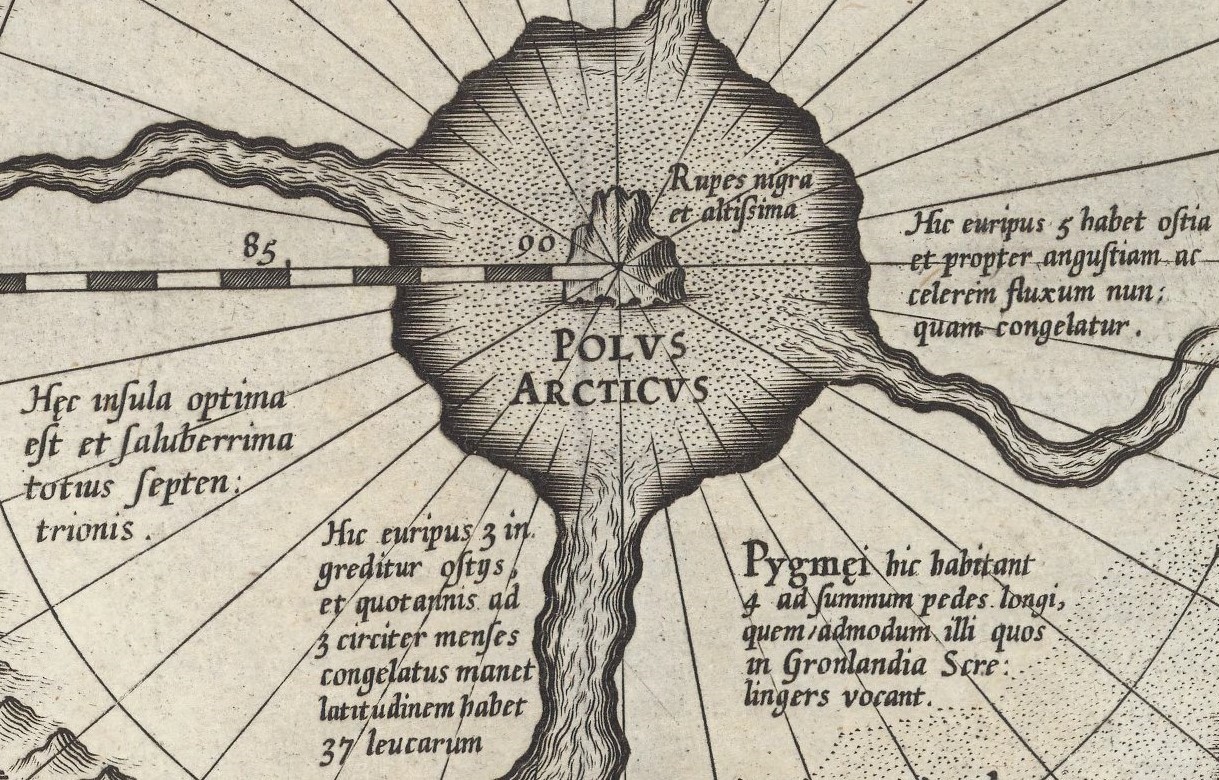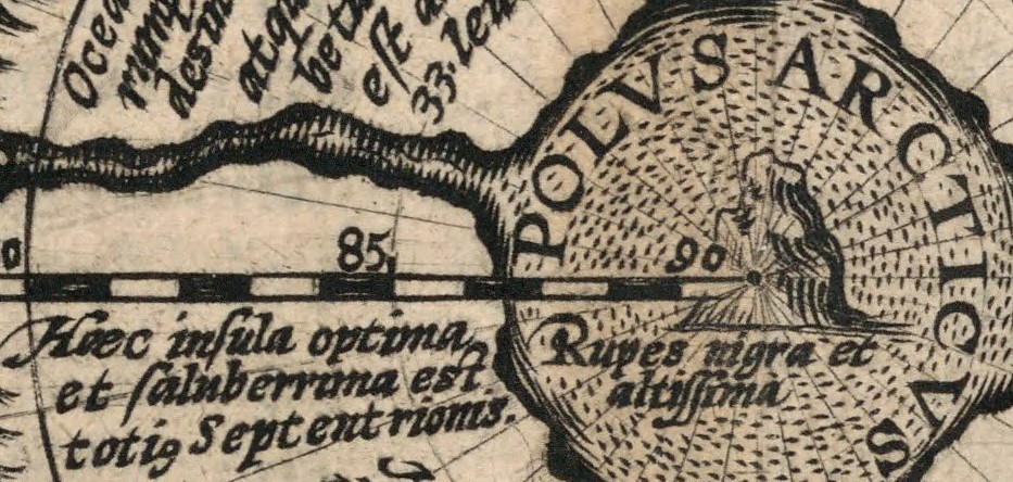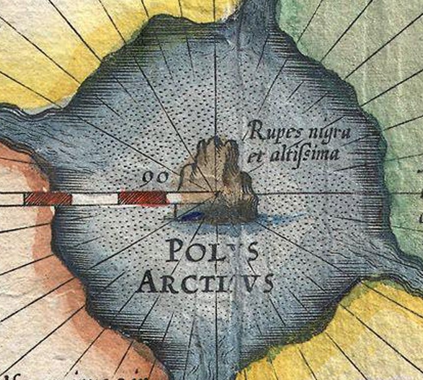 Conform relatării lui Jacobus Cnoyen (Jacobus Cnoyen a fost un autor din Brabant care a transmis descrieri ale Arcticii din lucrarea pierdută Inventio Fortunata), Polul Nord era o mare înconjurată de patru insule mari. Gerardus Mercator a citat mai târziu această relatare. Insulele erau despărțite de râuri masive care curgeau spre interior. În centrul acestor vârtejuri se afla o stâncă neagră și magnetică, uriașă. Stânca era „atât de înaltă încât abia putea fi zărită cu mare dificultate”.