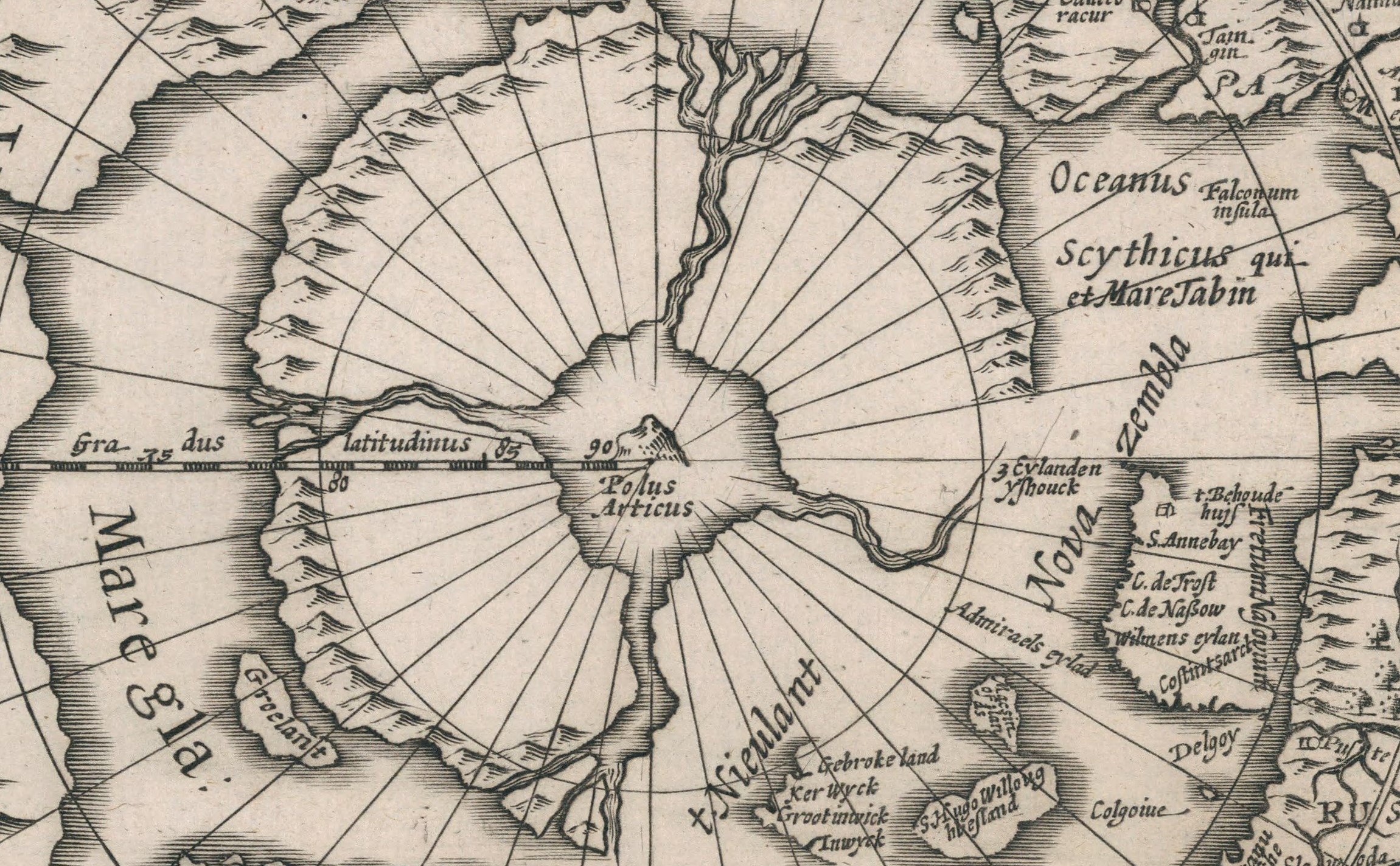 De asemenea, hărți arctice realizate de Jodocus Hondius la începutul secolului al XVII-lea preiau structura cvadripartită a Polului. În 1606, Jodocus Hondius a publicat o versiune actualizată a hărții Arcticii, urmând modelul lui Mercator, cu stânca magnetică și cele patru insule. A adăugat însă elemente decorative și denumiri geografice noi, combinând tradiția cartografică cu informații mai recente.