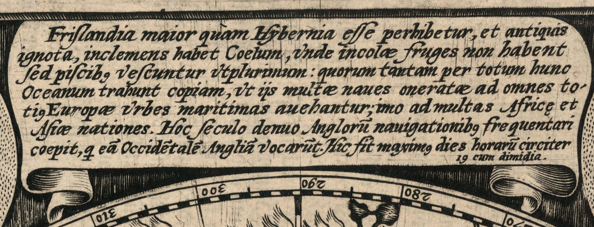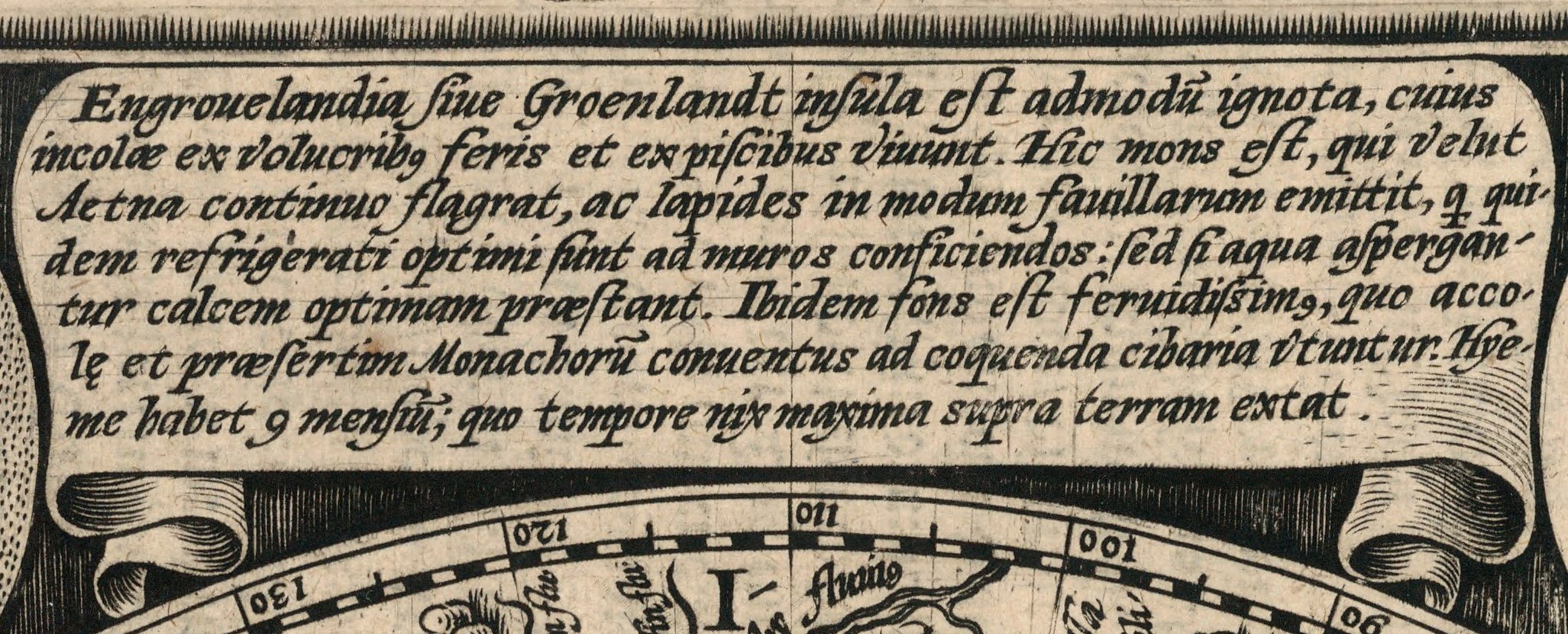 Pasajul în latină despre călugărul care a explorat nordul și „a înaintat prin arte magice” apare în nota explicativă de pe verso-ul hărții.