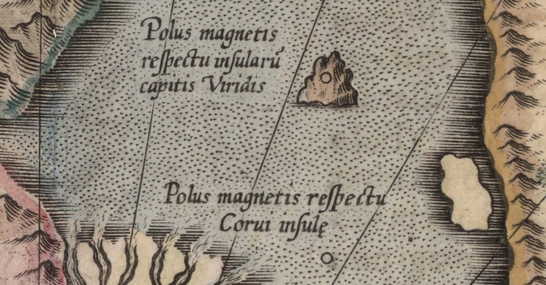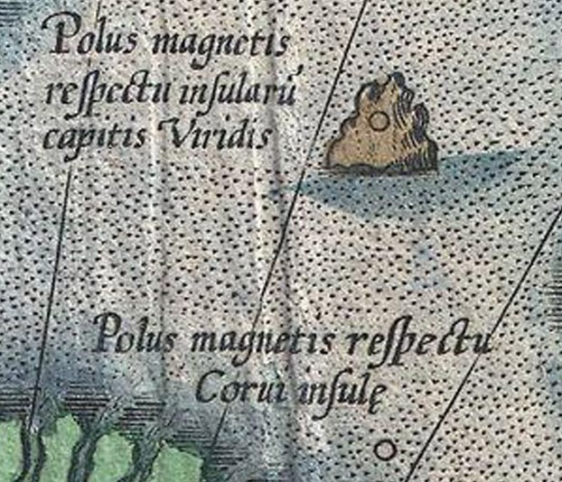 Deși mulți credeau că stânca de la Polul Nord era magnetică, Mercator a preferat să plaseze o altă stâncă magnetică în apropierea Strâmtorii Anian, pentru a explica variația magnetică a busolei. El a propus de fapt, existența a doi poli: unul raportat la un meridian care trecea prin insulele Capului Verde și un alt pol alternativ raportat la un meridian care trecea prin insula Corvo (Azore).